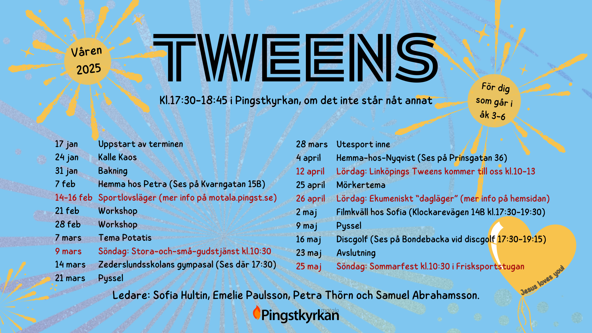 Varmt välkomna på Tweens! Vi har för det mesta våra träffar i Pingstkyrkan på fredagar kl.17:30-18:45. Det är för alla som går i åk.3-6. Vi börjar våra träffar med ”hiss-och-diss”, har en kort andakt…