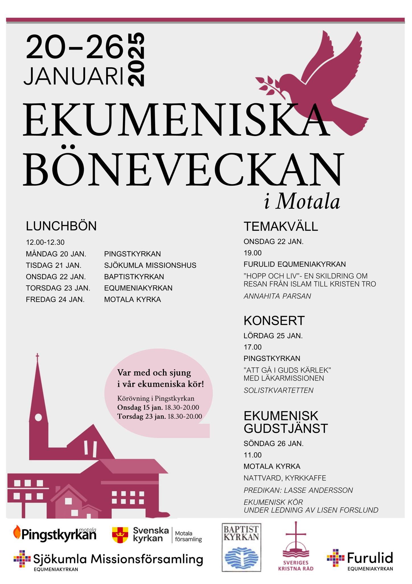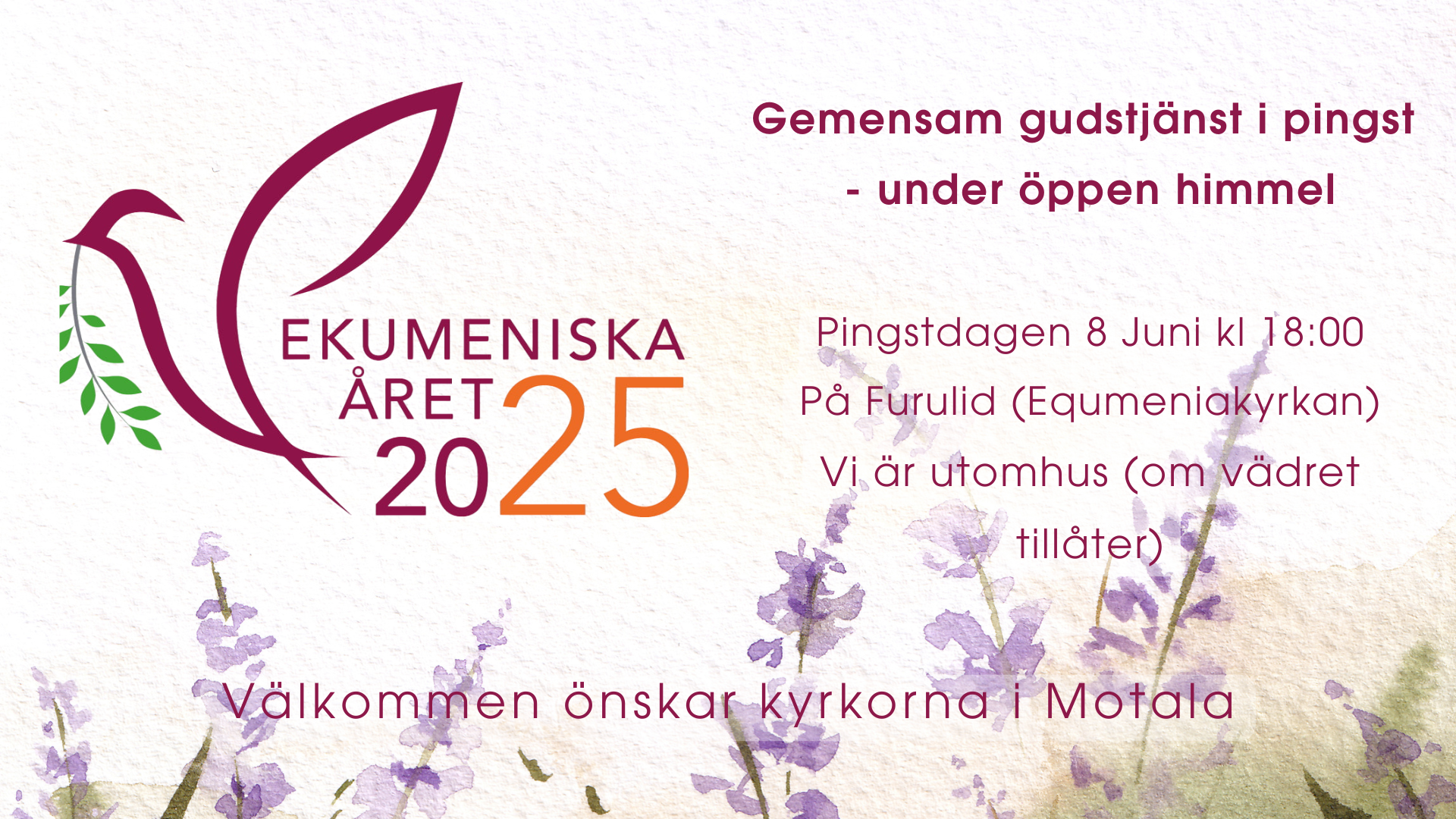 Välkommen med på den ekumeniska gudstjänsten på Pingstdagen. Den hålls på Furulid och är utomhus om vädret tillåter. Denna söndag är det alltså ingen gudstjänst i vår kyrka. Alla kyrkorna i Motala är med…
