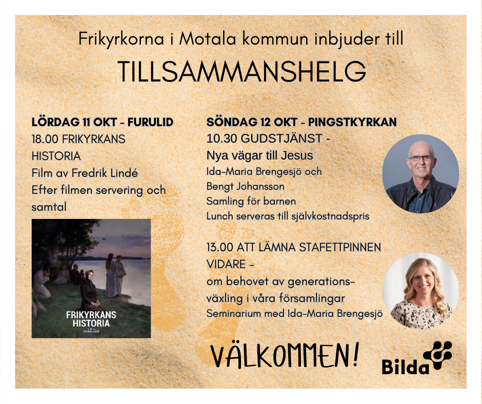 11-12 oktober inbjuder frikyrkorna i Motala till en helg tillsammans. Vi har besök av Ida-Maria Brengesjö som talar och Bengt Johansson som leder sången. Program Lördag 11 okt i Furulid 18:00 FRIKYRKANS HISTORIA –…