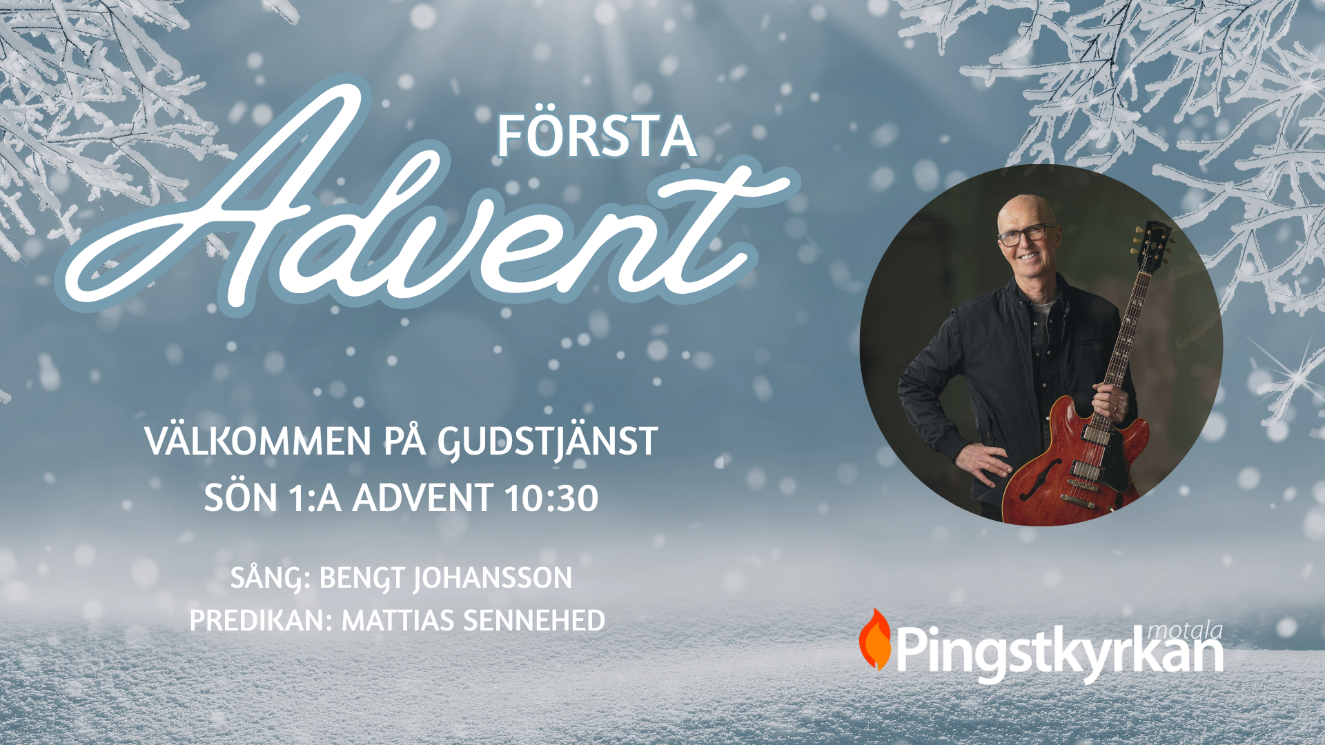 Välkommen till Pingstkyrkan i Advent. I gudstjänsten firar vi nattvard, Mattias Sennehed predikar och Bengt Johansson leder sången. Barnen har söndagsskola också. Efter gudstjänsten serveras adventsfika.